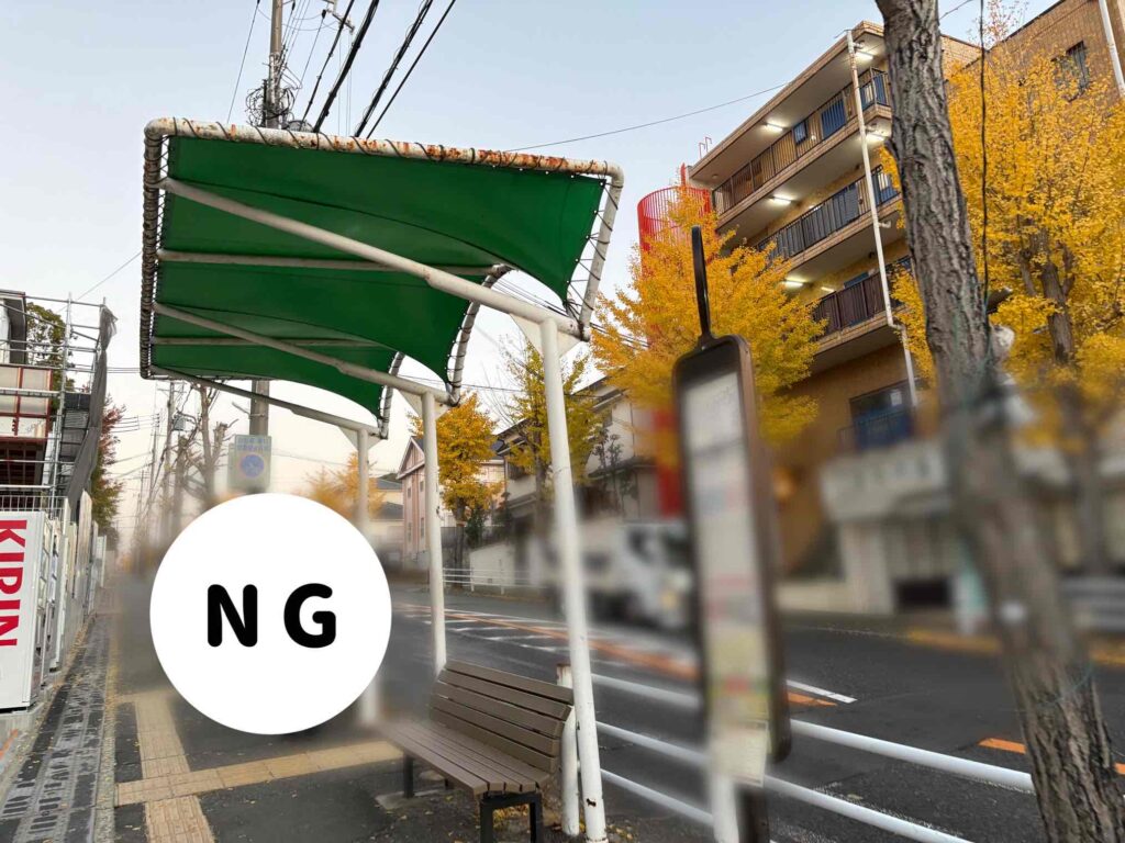 駅の階段を上り地上に上がると目の前に交差点が有るので、信号を渡り坂を数十メートルほど登ればバス停が有ります。